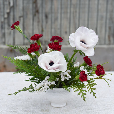 This collection of flowers represents our best red, white and green for Christmas. These flowers are equally at home on an elegant dining table or a Santa-themed den. Send a flower arrangement as a gift, or decorate your Christmas table.