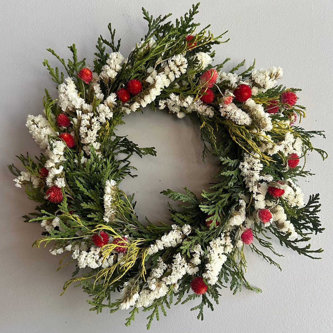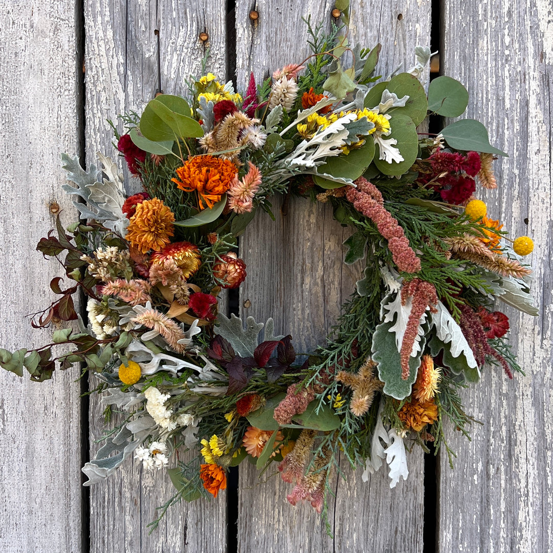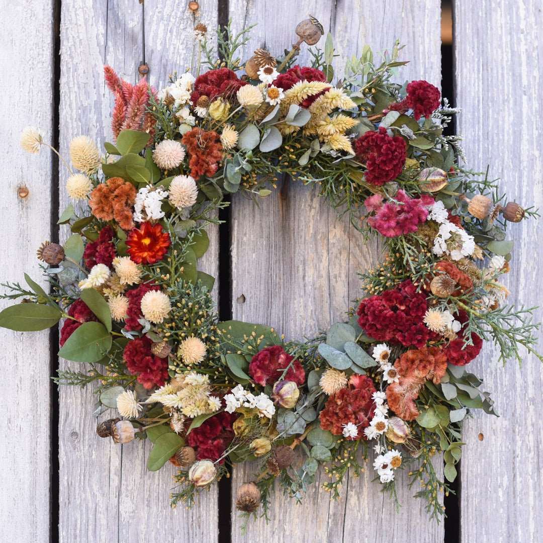 With a fresh greenery base made of seasonal greens like arborvitae, these wreaths are perfect for hanging outdoors. They will last throughout the cool season. Handmade using dried flowers and greenery from our farm.