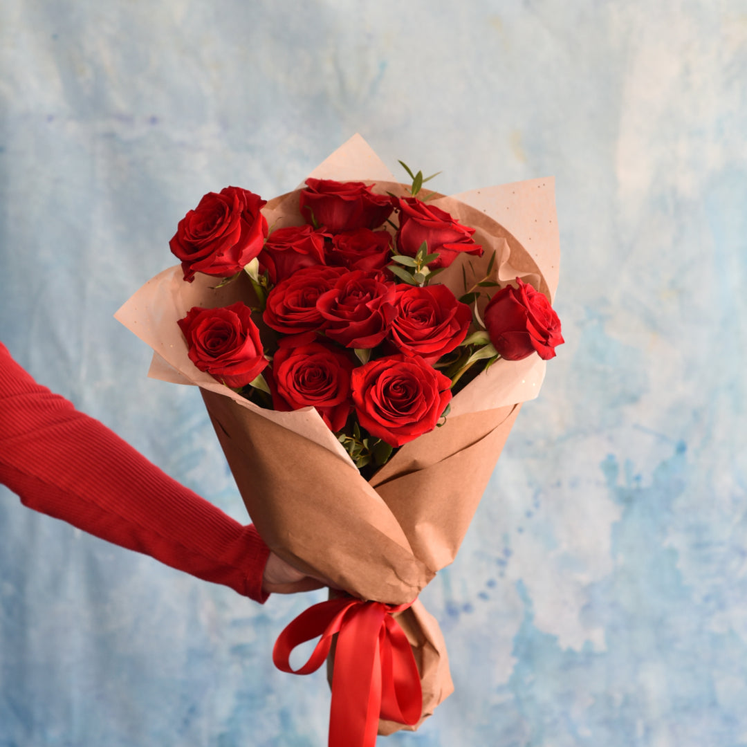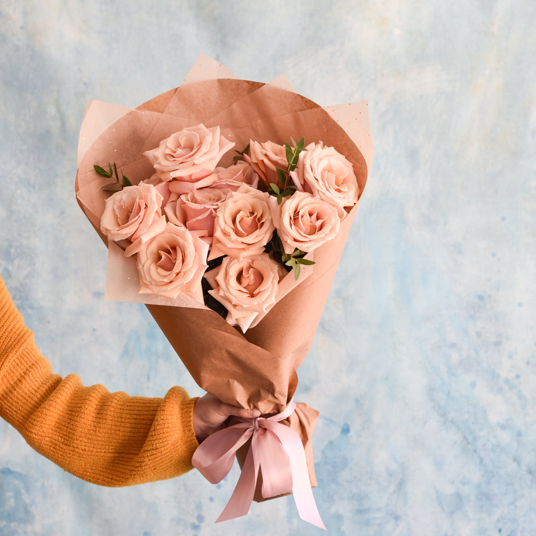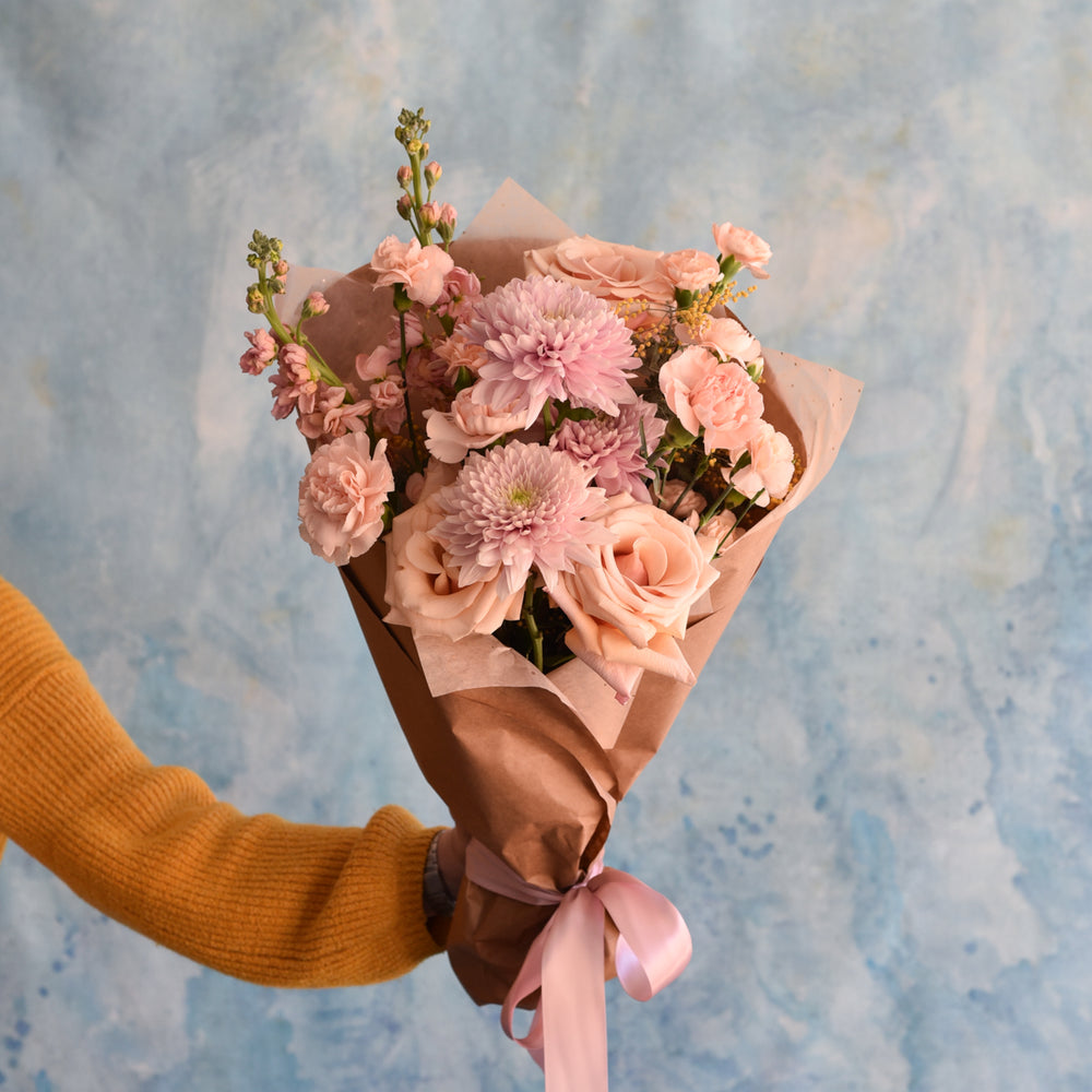 For Valentine's Day, we've created a beautiful selection of fresh flowers wrapped in brown paper with a concealed water source for delivery throughout Asheville, North Carolina. Pick up at our shop is also available. These floral arrangements combine seasonal blooms like chrysanthemums, tulips, stock, mimosa and nandina with roses and other blooms for a lush look befitting the holiday. As an Asheville florist, we take time to curate a wonderful combination of flowers for a natural and abundant look.