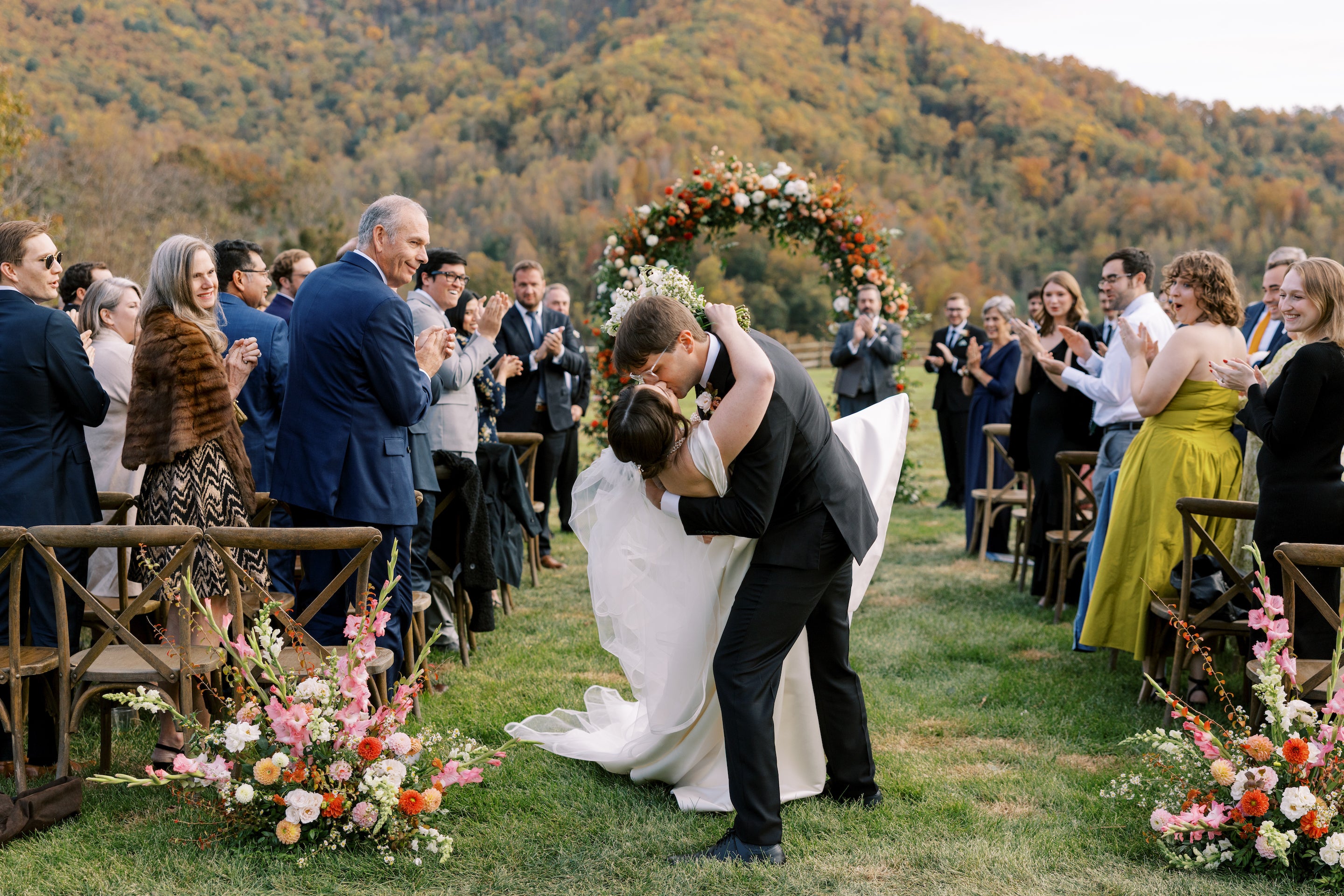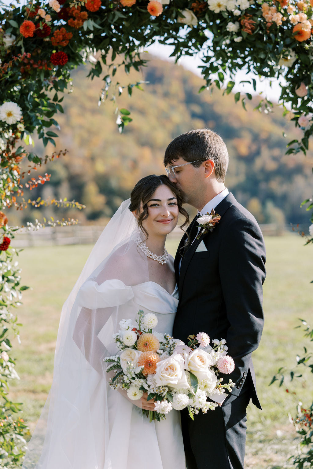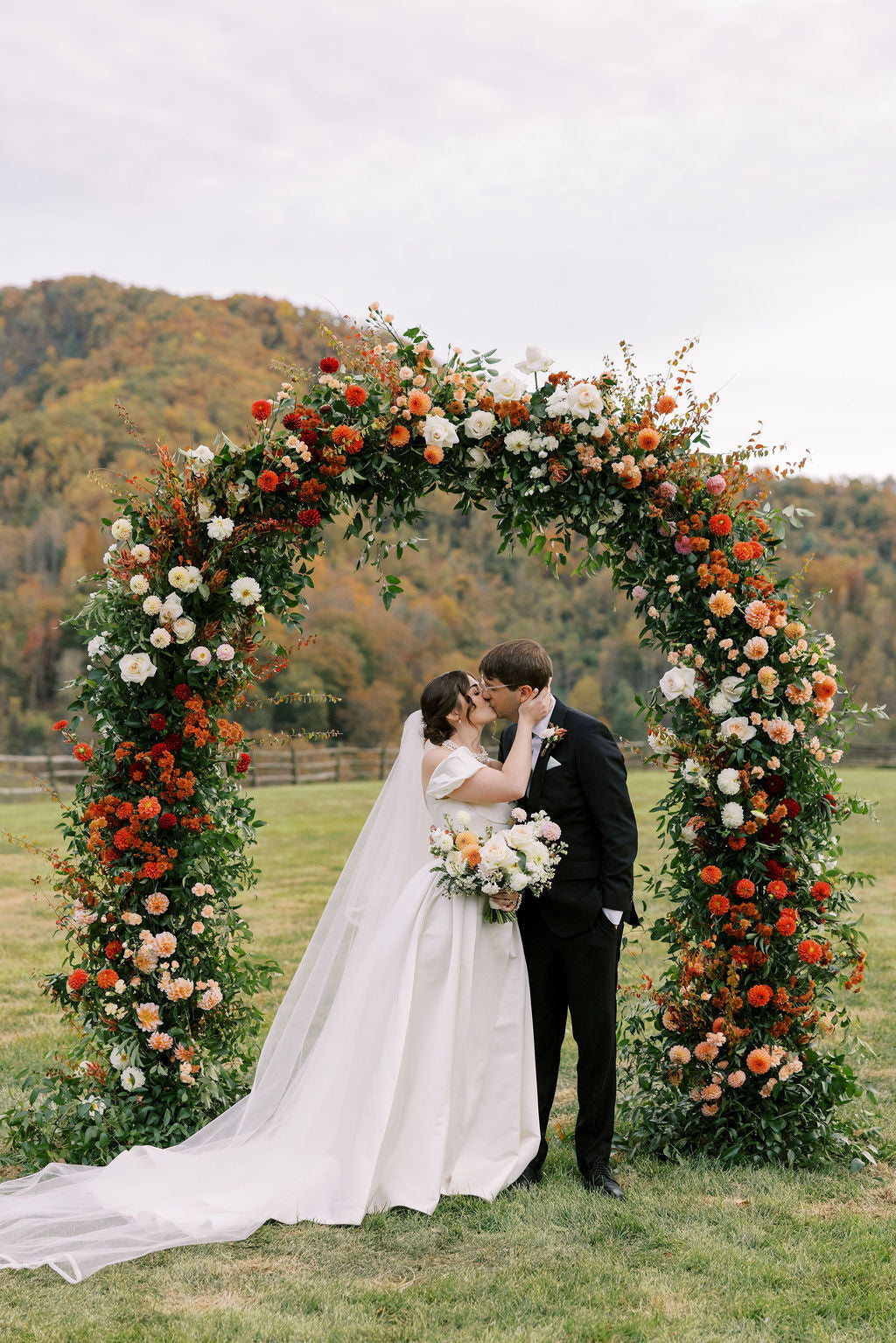 We accentuated the view with a full floral arch in fall colors that incorporated dahlias, heirloom chrysanthemums, garden-style roses and fall foliage.