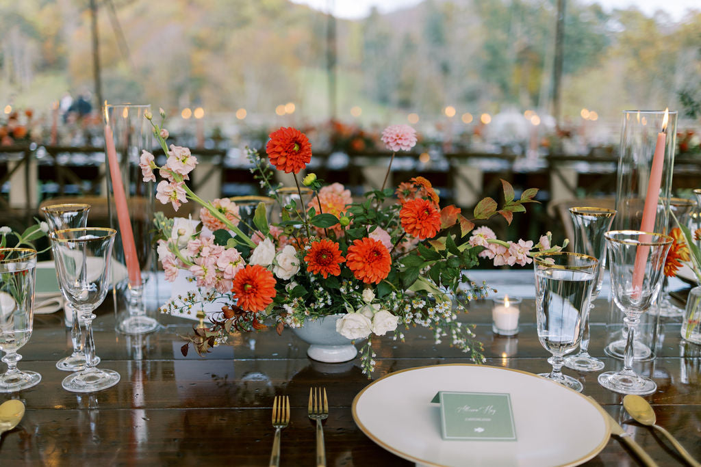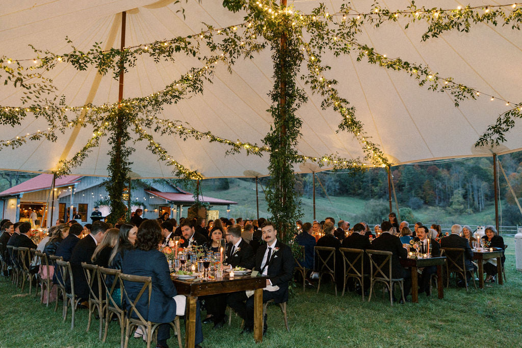 The reception seating in the sail cloth tent meant guests could enjoy the beautiful fall atmosphere as evening fell. We create a lush complement to the natural setting with full, overflowing compote centerpieces interspersed with bud vases and taper candles. We installed greenery on the tent poles and bistro lights, a clever way to bring nature inside!