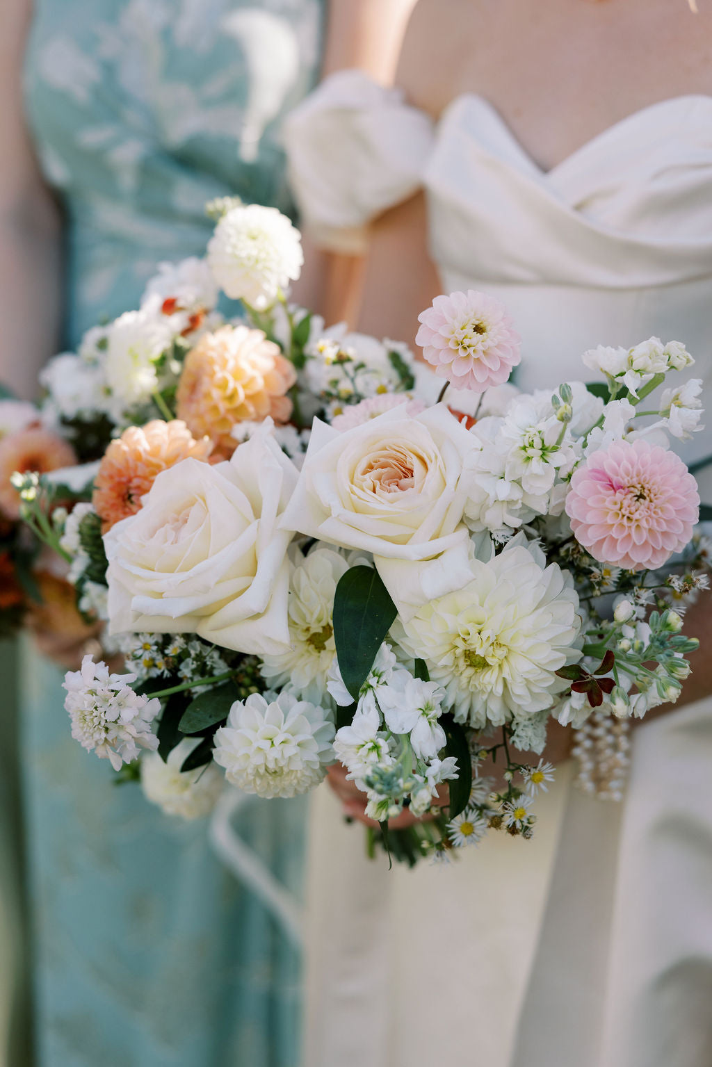 Killian chose soft colors for her bouquet that bridged the gap between her bridal whites and the autumn color palette in the flowers. We also added a pop of pink, Killian's favorite color!