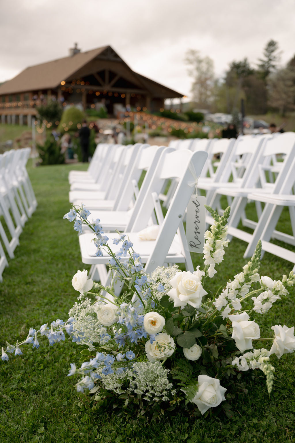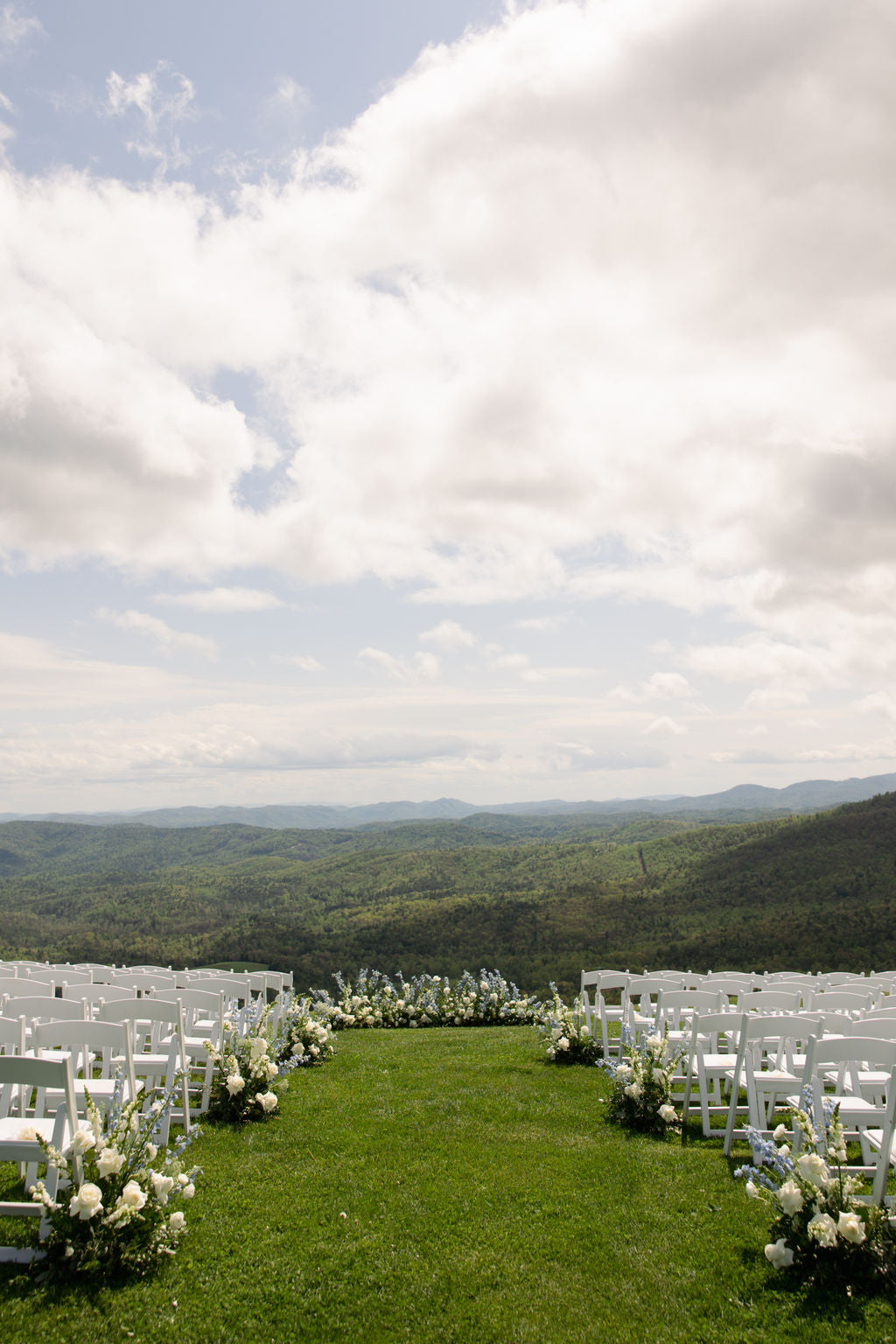 For the ceremony, we created low floral accents to create lush decor for the aisle and highlight the mountain view. We combined aisle meadows along the aisle with a ground arbor behind the ceremony.
