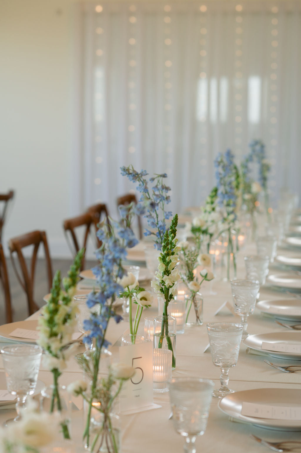 The reception florals were simple but elegant with many bud vases. The ground arbor and meadows from the ceremony moved indoors to create a focal point around the sweetheart table.
