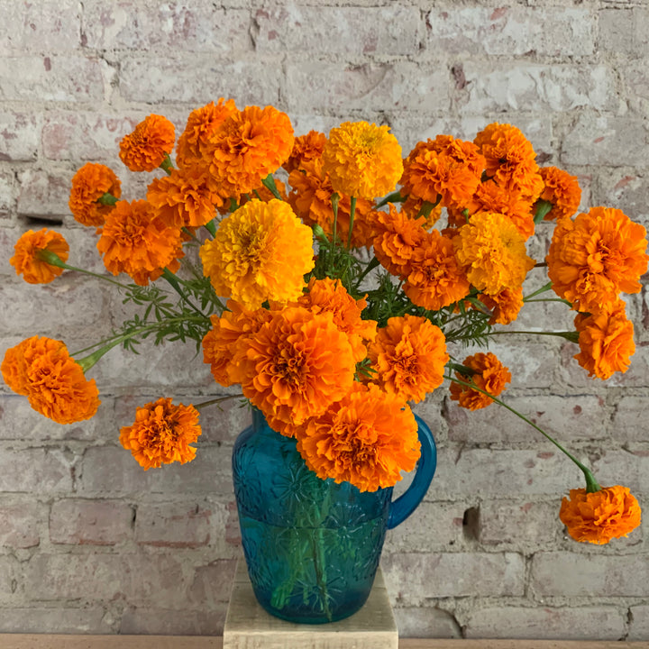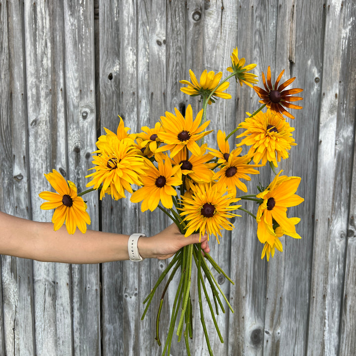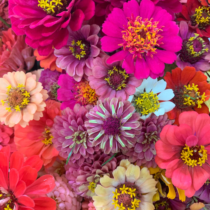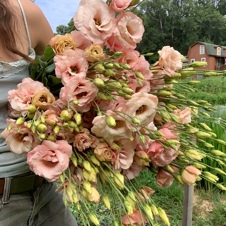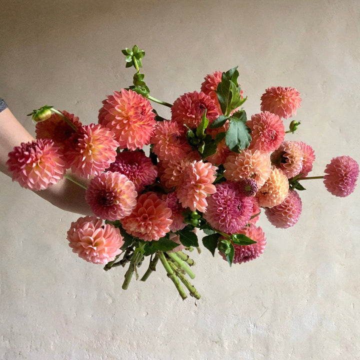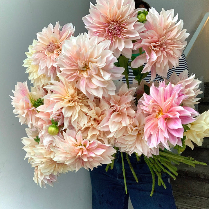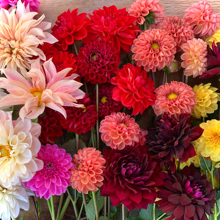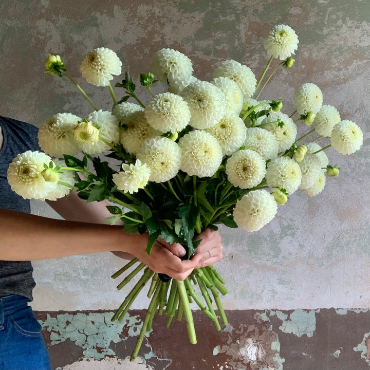 In fall, dahlias, lisianthus, rudbeckia, zinnias, chrysanthemums, Japanese anemones and cosmos are looking gorgeous at our farm. We pair them with an array of other blooms and foliages, such as lilies, calla lilies, gladiolus, liatris, larkspur, scabiosa, sunflowers, basil, dusty miller, delphinium, eryngium, bee balm, feverfew, echinacea, celosia, ageratum, marigolds and gomphrena.