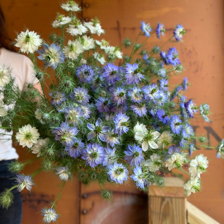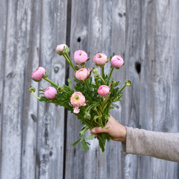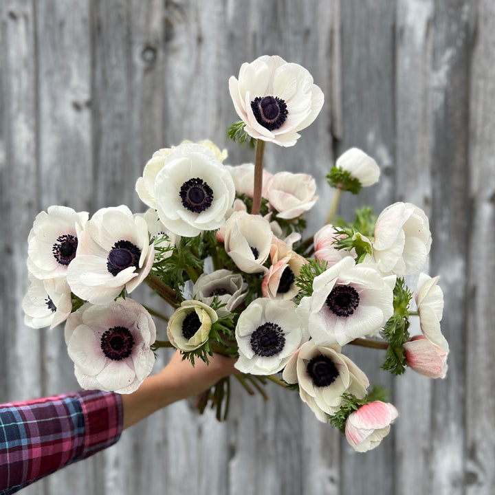 In winter, we source the finest blooms for your day, including anemones, ranunculus, tulips, lisianthus, chrysanthemums, scabiosa, amaryllis, astrantia, brunia, birch, delphinium, thistle, calla lily, roses, amaranth, hypericum, veronica, carnations, stock, feverfew, chocolate cosmos, seed pods, grasses, dusty miller, camellia foliage, ninebark, euphorbia, and many others. We pair them with foraged evergreens from our farm and dried flowers from our collection.