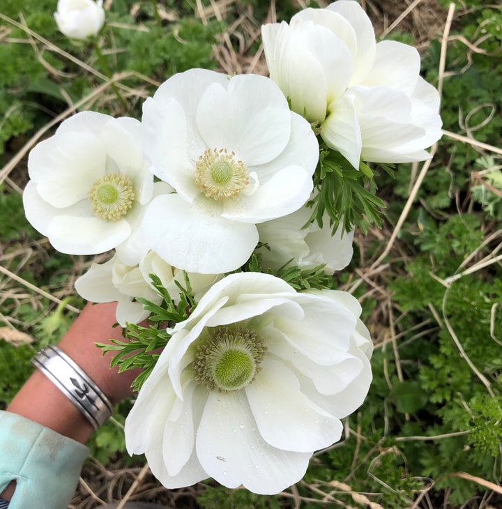 In early spring, tulips, anemones, ranunculus and poppies are looking gorgeous at our farm. We will pair them with roses and an array of smaller blooms and foliages, such as sweet william, daffodils, spirea, viburnum, sweet pea, delphinium, nigella, foxglove, snapdragons, feverfew, viburnum, and many others.